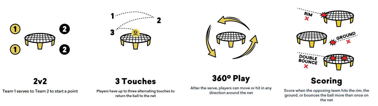A player starts a point by serving the ball down onto the Spikeball net so it ricochets up at his opponents. The returning team has up to 3 hits between them (think bump, set, spike) to return the ball back onto the net. The rally continues until a team can't return the ball onto the net within their three touches.